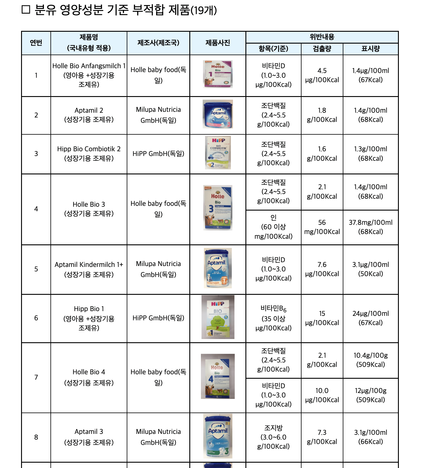 특히 분유 관련하여 우리나라 식약처에서 기준 부적합 제품으로 정한 건만 19개가 있습니다.