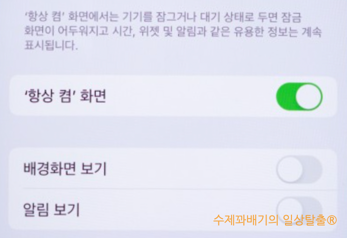 아이폰 14 PRO의 AOD 기능이 너무나도 밝아 사용하지 않고 있어도 주변 사람들이 "너 핸드폰 켜진 거 아냐?"라는 질문을 많이 받곤 합니다. 이번에 개선된 사항으로 갤럭시처럼 배경화면을 끌 수 있는 기능이 생겨 시계와 날짜만 AOD(ALWAYS on DISPLAY) 활성화시킬 수 있습니다.